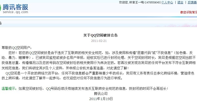 温馨提示:如果空间被封后,QQ号码后续没有继续发布违反互联网安全规范的信息,则封闭的时间不会再延长!